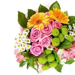 • Уменьшенный - 5 роз, зелень, оформление, упаковка, лента
