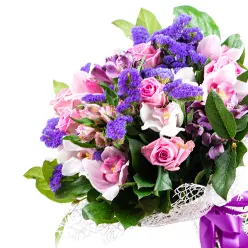 • Средний- роза - 5 шт., альстромерия - 7 шт., зелень, упаковка, лента