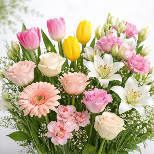 Да, вы можете выбрать разные виды растений из каталога (например, розы, ирисы и зелень эвкалипта), соблюдая минимальную кратность для каждой позиции. Наши флористы аккуратно соберут их в единую гармоничную композицию под ленту.