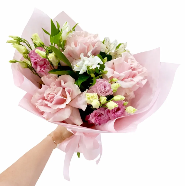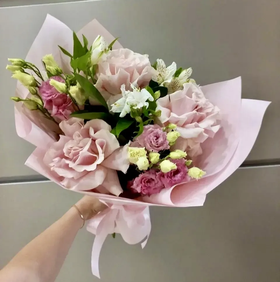 Нежный букет из пудрово-розовой французской розы, розовой эустомы и альстромерии - гармония утончённой романтики и живой природной красоты. Пышные, многолепестковые бутоны французской розы придают композиции благородство и глубину, воздушная эустома добавляет лёгкость и мягкость, а изящная альстромерия оживляет букет тонкими акцентами и динамикой. Вся композиция выглядит свежо, изысканно и по-настоящему трогательно - идеальный выбор для выражения нежных чувств и особого внимания.
