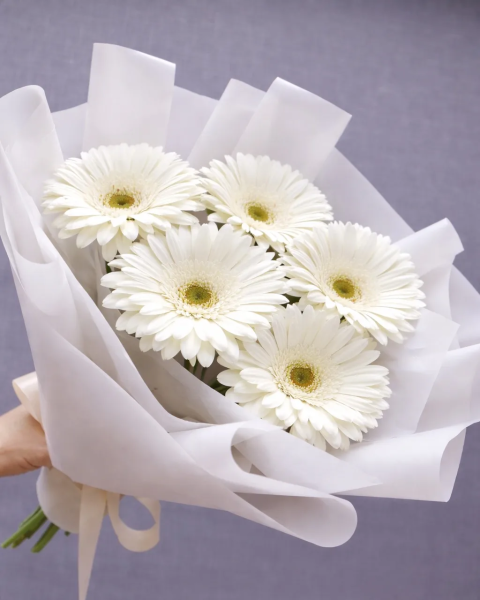Лаконичный и элегантный букет из белых гербер в светлой упаковке создаёт ощущение чистоты и гармонии. Универсальный подарок для нежного и искреннего жеста.