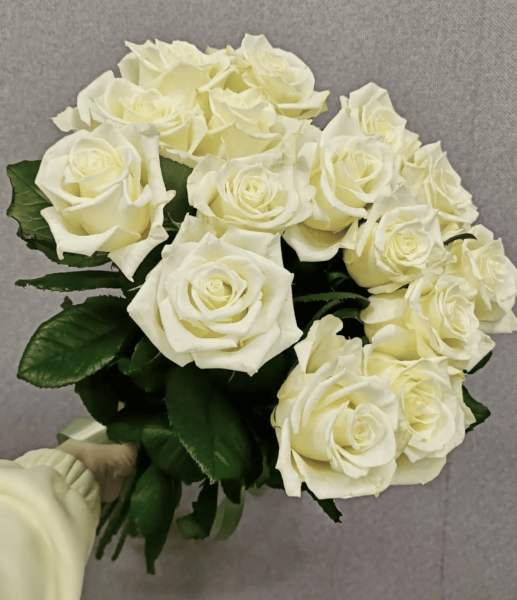 Изысканный букет из 15 белых роз - воплощение чистоты, гармонии и безупречного вкуса. Пышные свежие бутоны с нежными лепестками создают эффектную композицию, которая выглядит одновременно торжественно и утончённо. Такой букет идеально подойдёт для самых значимых моментов: признания в любви, свадьбы, юбилея или особого знака внимания.