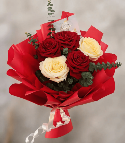 Букет из 5 роз - гармоничное сочетание страстных красных и нежных белых бутонов, дополненное свежим эвкалиптом. Такая композиция символизирует любовь, искренность и чистые чувства, создавая яркий и запоминающийся образ для любого повода.