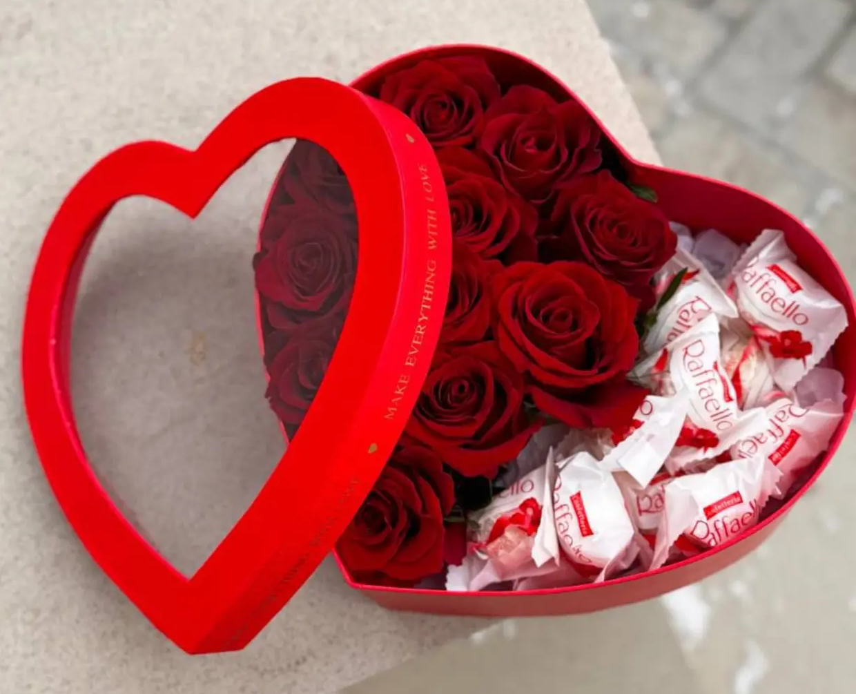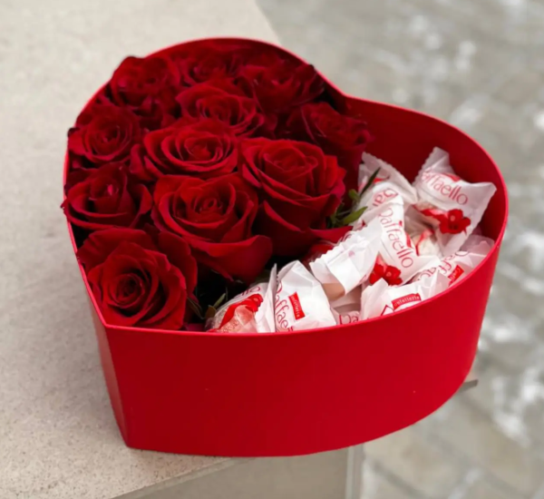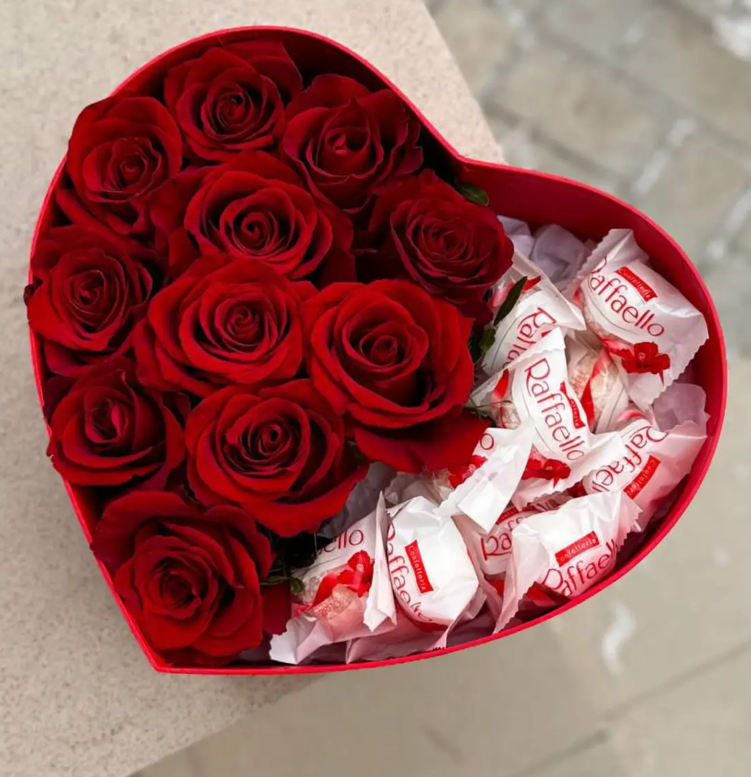 Эффектный и по-настоящему романтичный подарок, который говорит о чувствах без слов. Бархатные бутоны красных роз символизируют страсть и любовь, а нежные конфеты Raffaello добавляют сладкое настроение и делают композицию ещё более особенной.