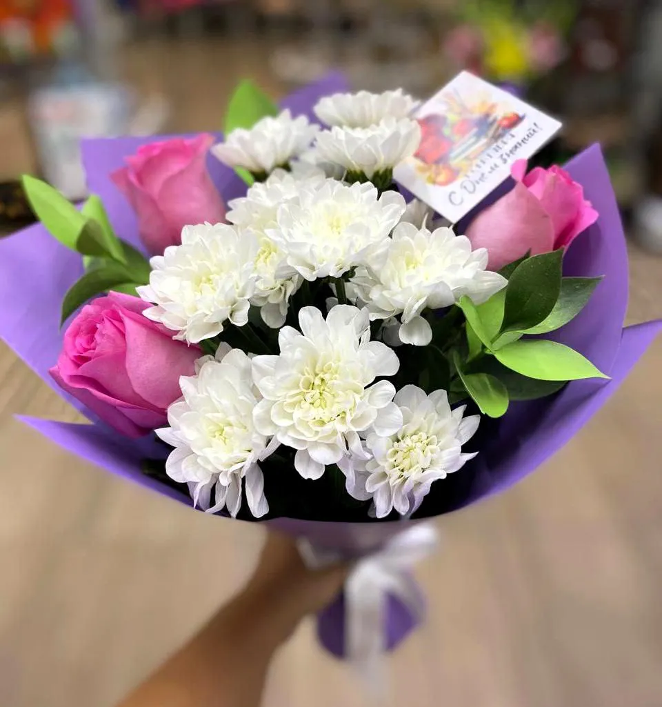 В шахматной игре цветов, каждая деталь играет свою роль: розы, как вестники любви и восхищения, гармонично сочетаются с хризантемами, которые символизируют чистоту и доброту. Букет наполнен игривостью и элегантностью, привлекая внимание и вызывая восхищение своей красотой. Он станет прекрасным подарком для близкого человека или нежным украшением любого интерьера, придавая ему яркость и уют.