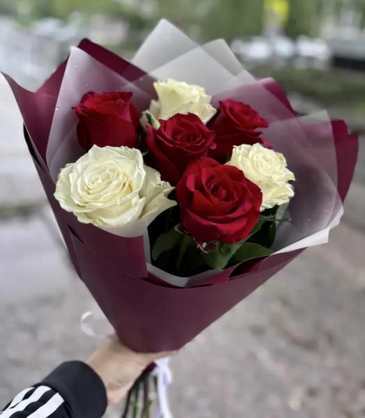 Букет «Два чувства» - изысканная композиция из белых и красных роз в глубокой бордовой упаковке, символизирующая гармонию любви и искренности. Алые розы передают страсть, силу эмоций и яркость чувств, в то время как белые бутоны олицетворяют чистоту, нежность и доверие. Вместе они создают красивый контраст, наполненный особым смыслом. Бордовая упаковка подчёркивает глубину оттенков и придаёт букету благородный, выразительный характер. Такой букет станет идеальным подарком для признания, важных слов и особенных моментов.