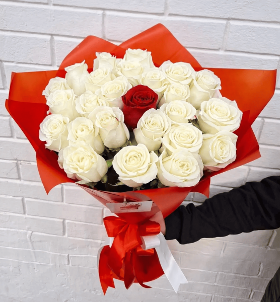 Контраст оттенков делает букет эффектным, стильным и запоминающимся. Элегантная упаковка подчёркивает красоту композиции, придавая ей завершённый и праздничный вид. Такой подарок идеально подойдёт для признания в любви, годовщины, романтического сюрприза или важного события.