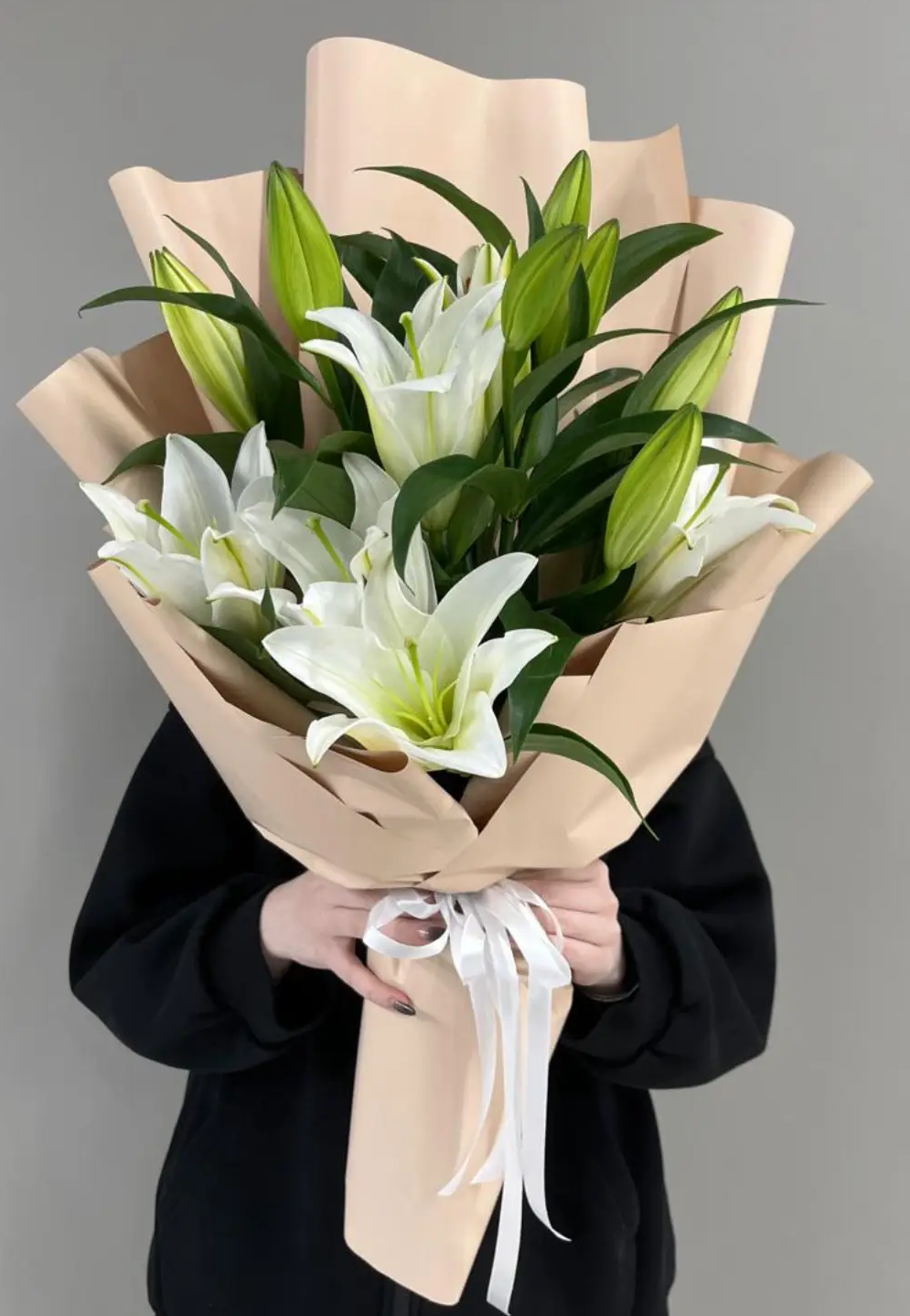 Изысканный букет из белых лилий очаровывает своей чистотой и благородной простотой. Крупные ароматные бутоны раскрываются плавно, наполняя пространство лёгким, утончённым ароматом и создавая атмосферу гармонии и уюта. Белый цвет символизирует искренность, нежность и светлые чувства, делая композицию особенно трогательной и значимой.