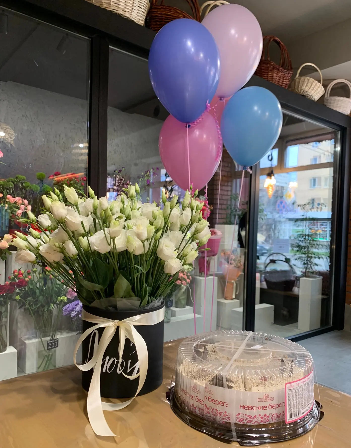 • Состав: эустома - 11 шт., оазис, шляпная коробка