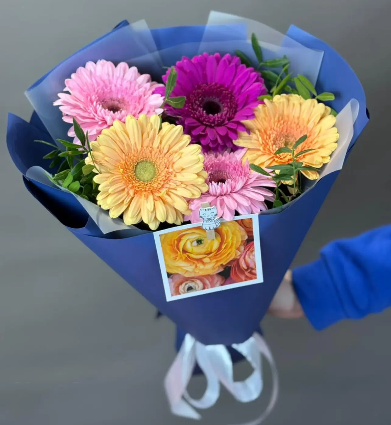 гербера - 5 шт., зелень, упаковка, лента |