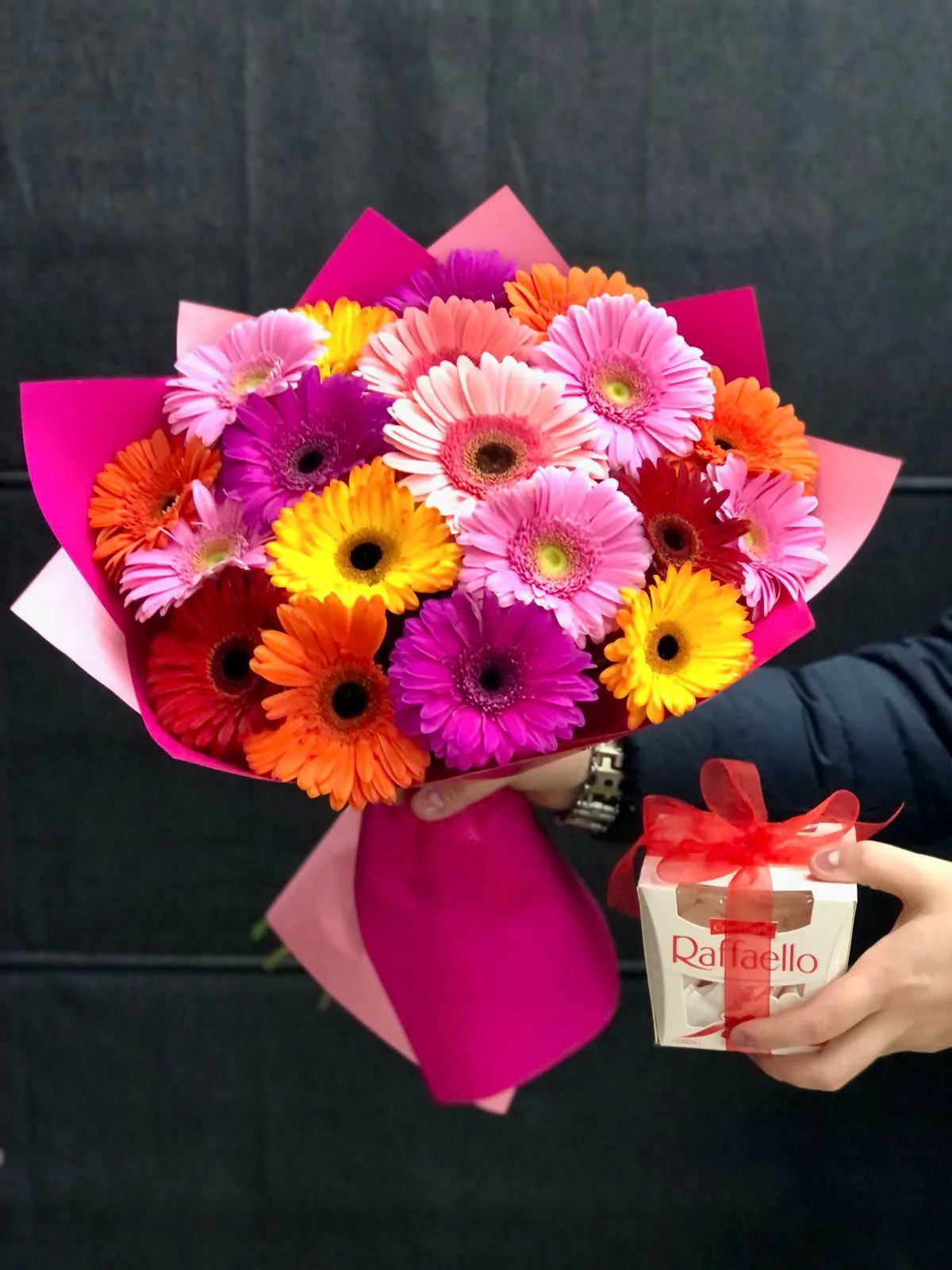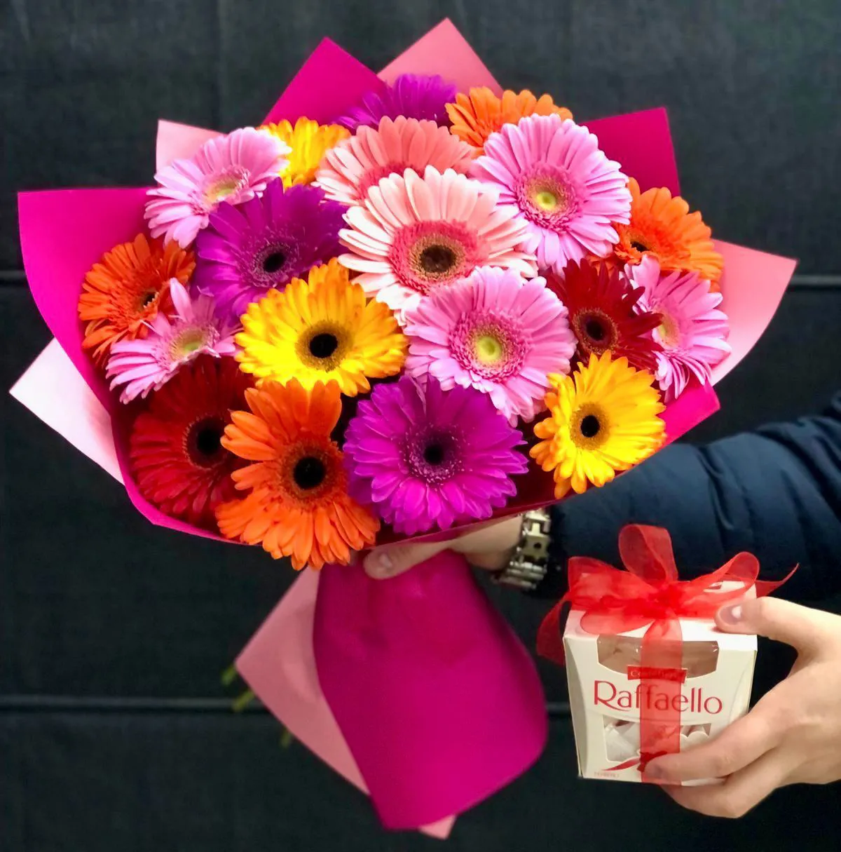 Герберы,упаковка,лента и рафаэлло