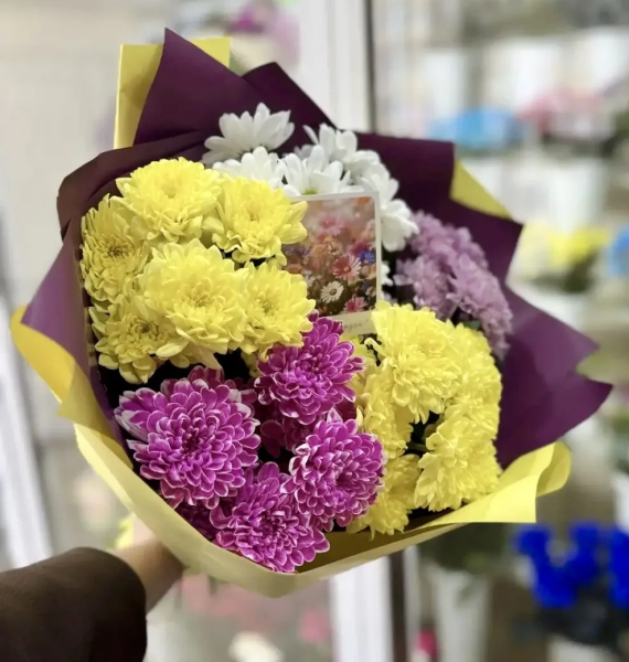 Яркий и жизнерадостный букет из разноцветной кустовой хризантемы наполняет пространство теплом, светом и позитивными эмоциями. Сочетание разных оттенков создаёт живую и динамичную композицию, которая выглядит объёмно, свежо и привлекательно.