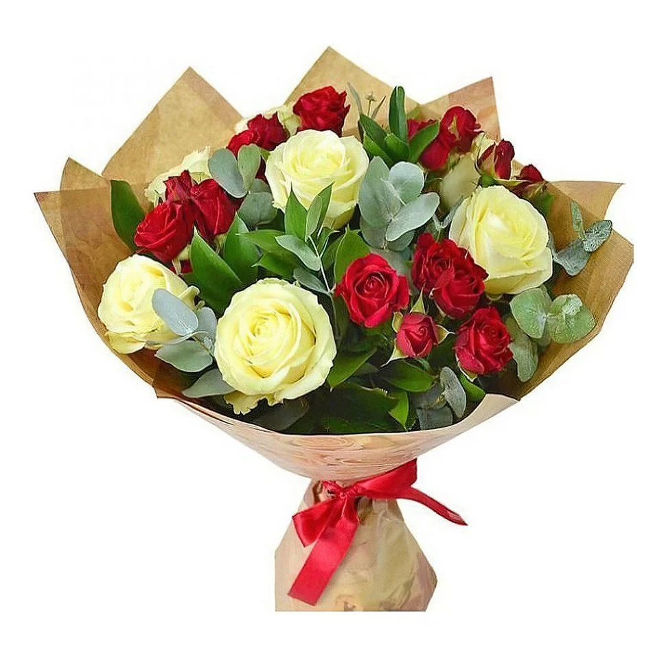 Вариант—Небольшой - роза - 3 шт., роза кустовая - 2 шт., зелень, упаковка, лента