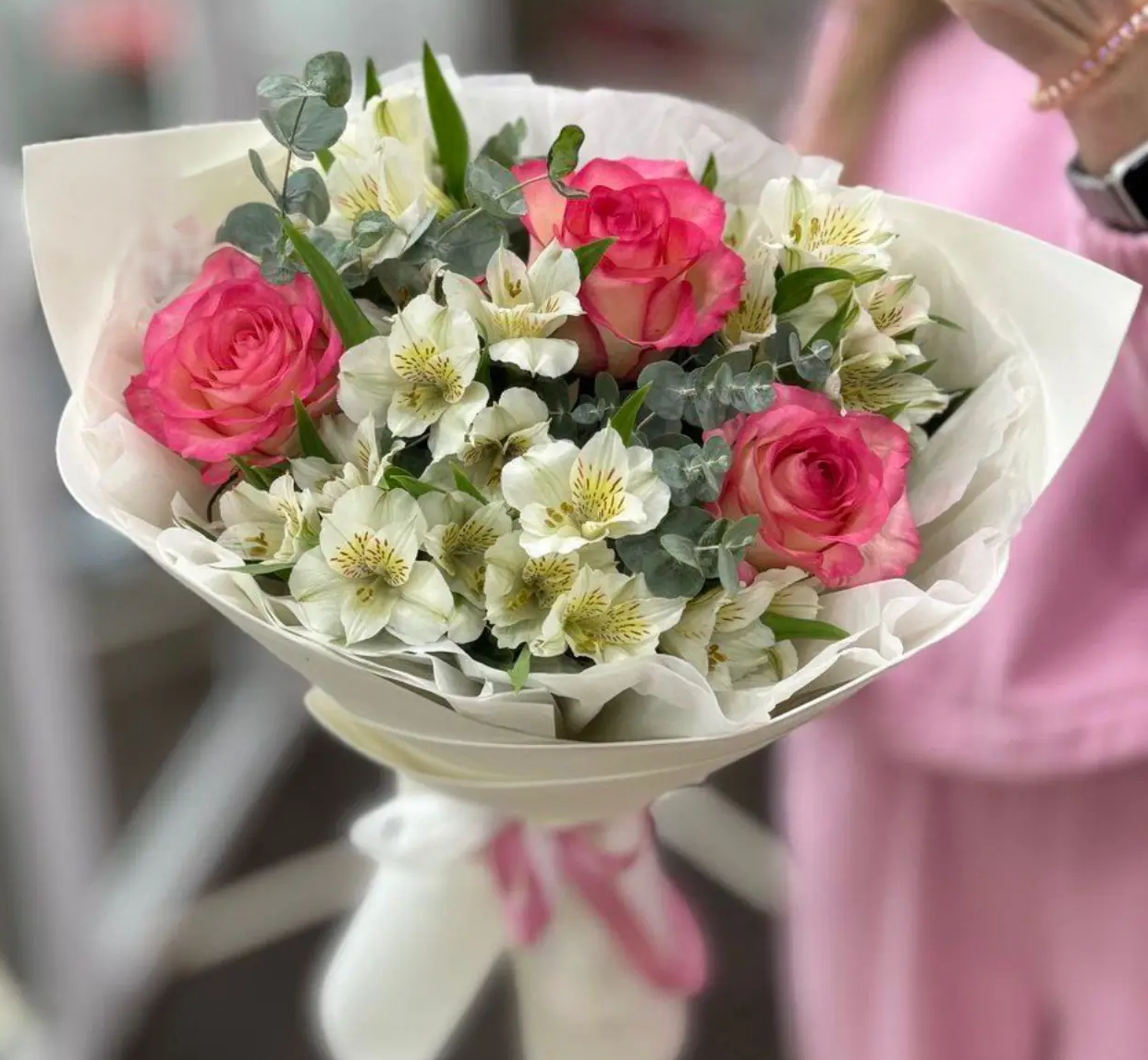 Изысканный букет, в котором гармонично сочетаются утончённые розы с их нежными розово-кремовыми лепестками, воздушная белая альстромерия и ароматный эвкалипт. Эта композиция словно создана для того, чтобы передать самые тёплые чувства — любовь, благодарность и искреннюю заботу.