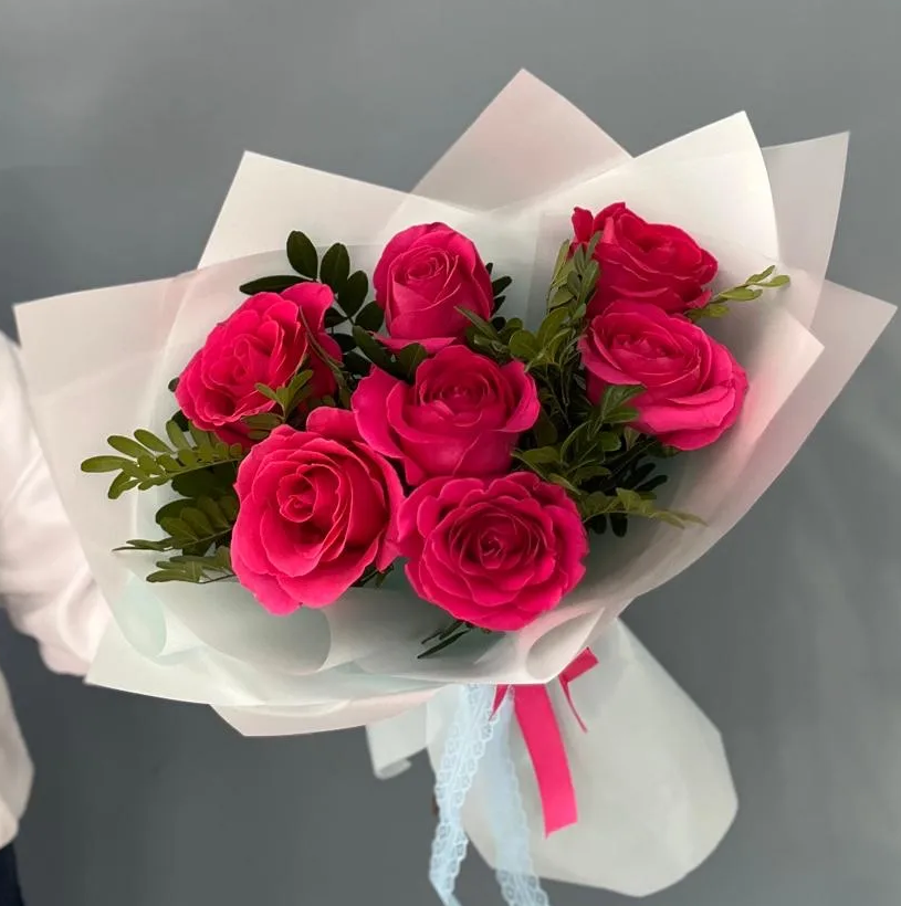 Букет из 7 малиновых роз с зеленью в стильной упаковке - выразительное сочетание ярких эмоций и природной гармонии.