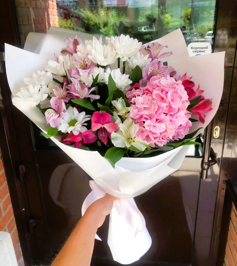 Гортензия, альстромерия, ромашковая хризатема |