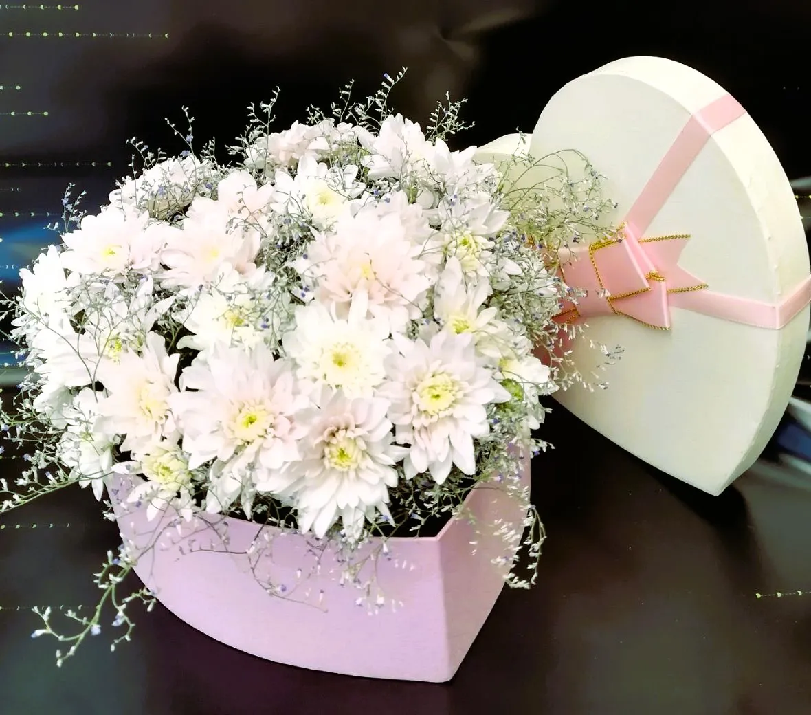 Форма сердца, в которой размещены хризантемы, придаст этому букету особую изюминку. Такие цветы прекрасно подойдут для различных поводов: от празднования дня рождения до романтического свидания или простого выражения своих чувств.