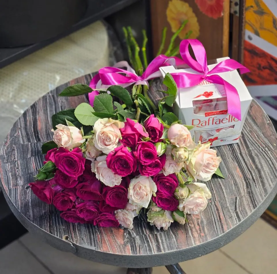 - Средний - кустовая роза 7 шт, лента, рафаэлло