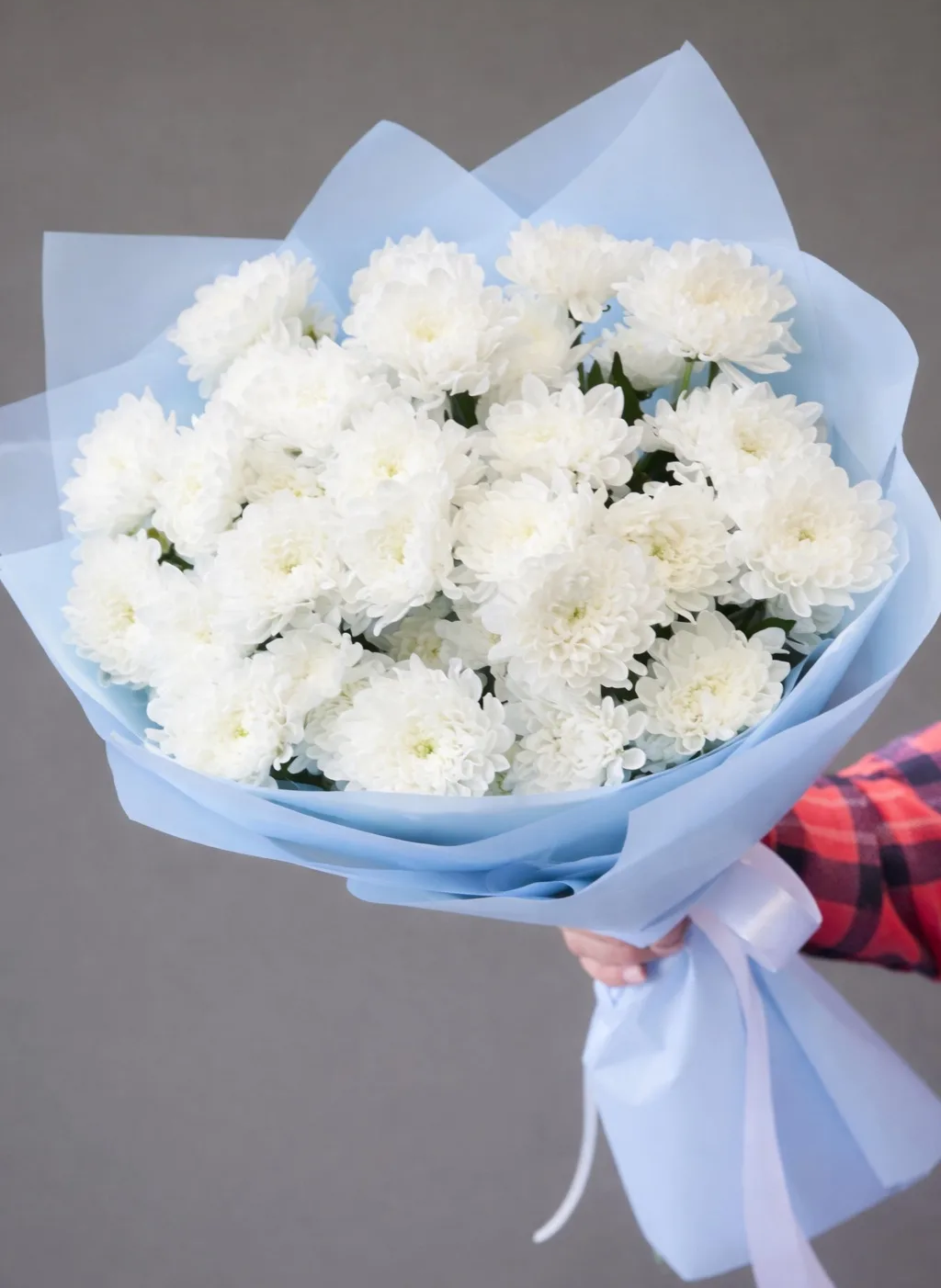 Нежный и гармоничный букет из белой кустовой хризантемы очаровывает своей лёгкостью и естественной красотой. Пышные соцветия создают воздушный объём, наполняя композицию свежестью и спокойствием. Голубая упаковка добавляет букету мягкое настроение и подчёркивает чистоту оттенков.