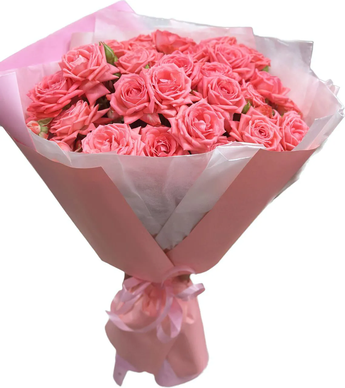 Кустовые розовые розы, упаковка, лента