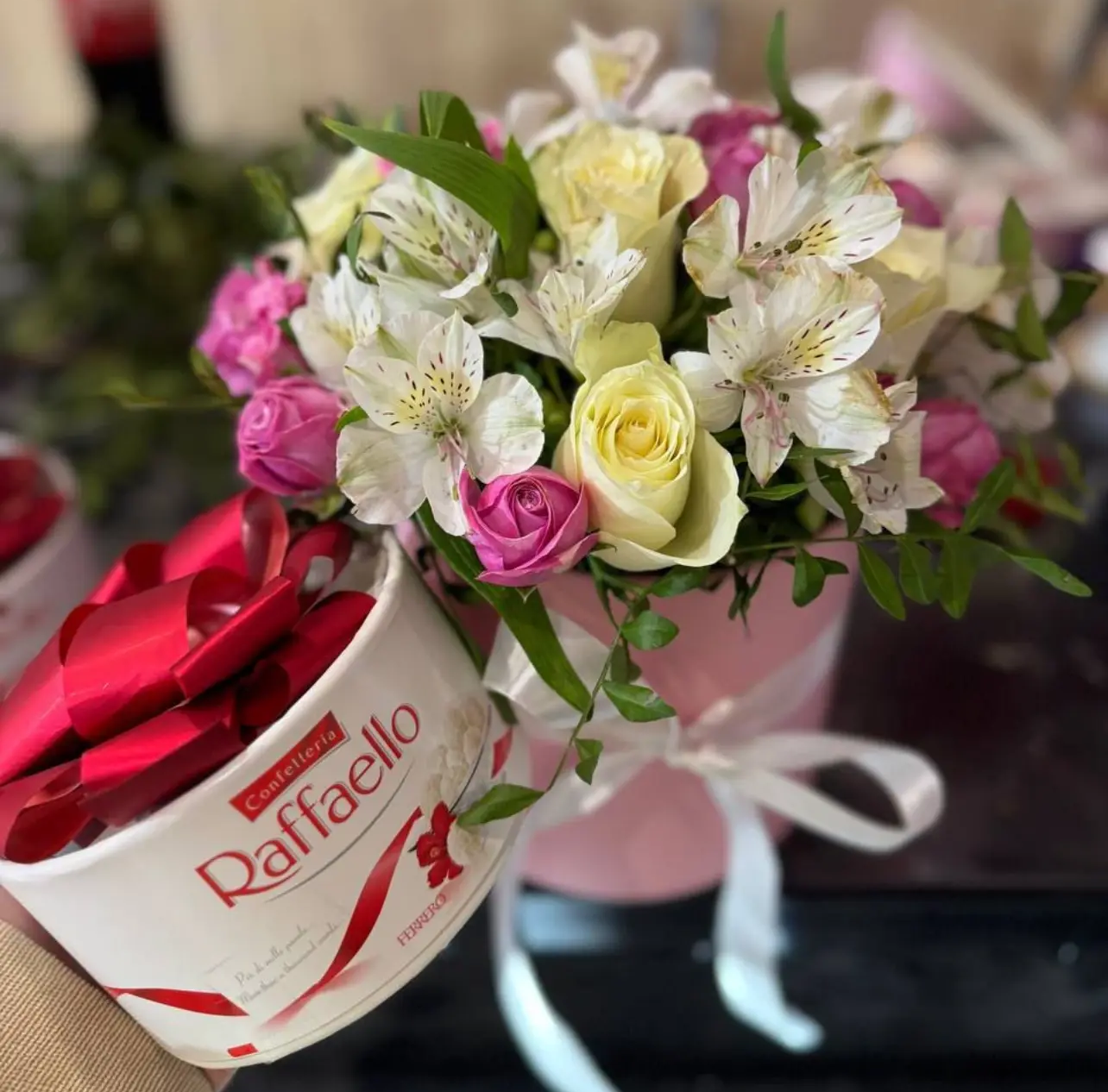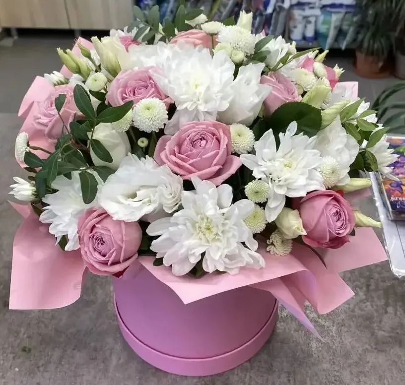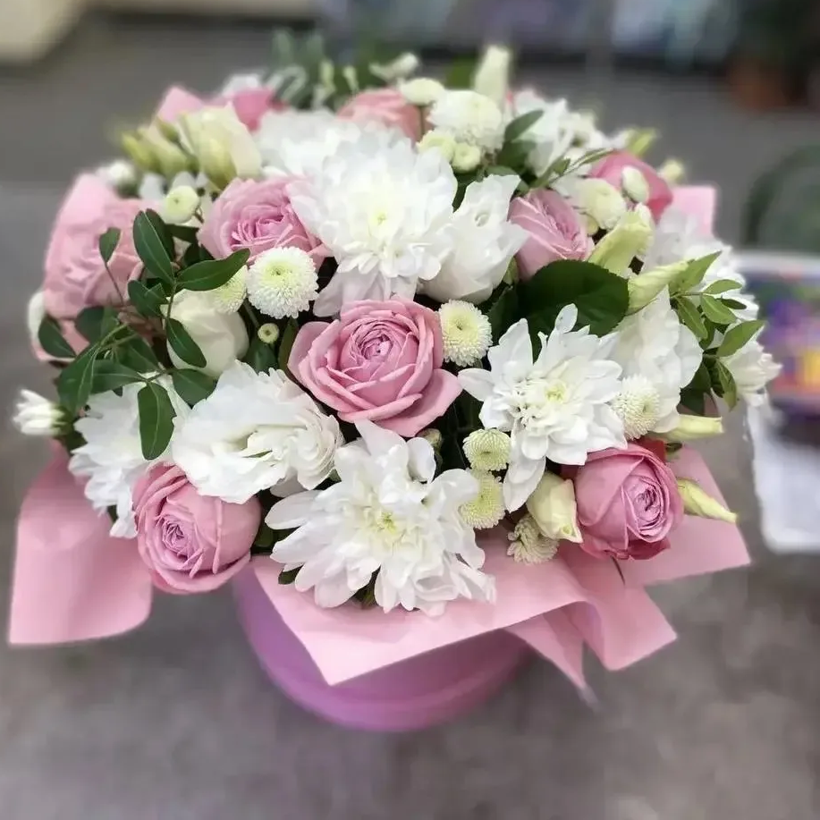 Нежная цветочная композиция в  шляпной коробке смотрится органично, а добавление зелени и альстромерии обеспечивает естественность.