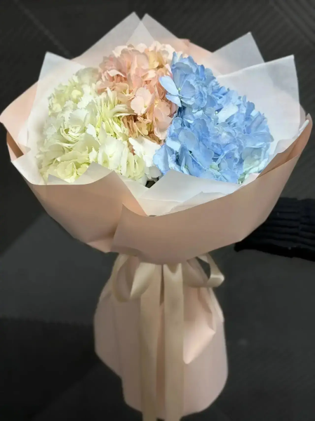 Воздушная и утончённая композиция из гортензий в белых, голубых и розовых оттенках создаёт ощущение лёгкости и гармонии. Пышные соцветия формируют объёмный и нежный букет, который словно окутывает мягкостью и спокойствием.
