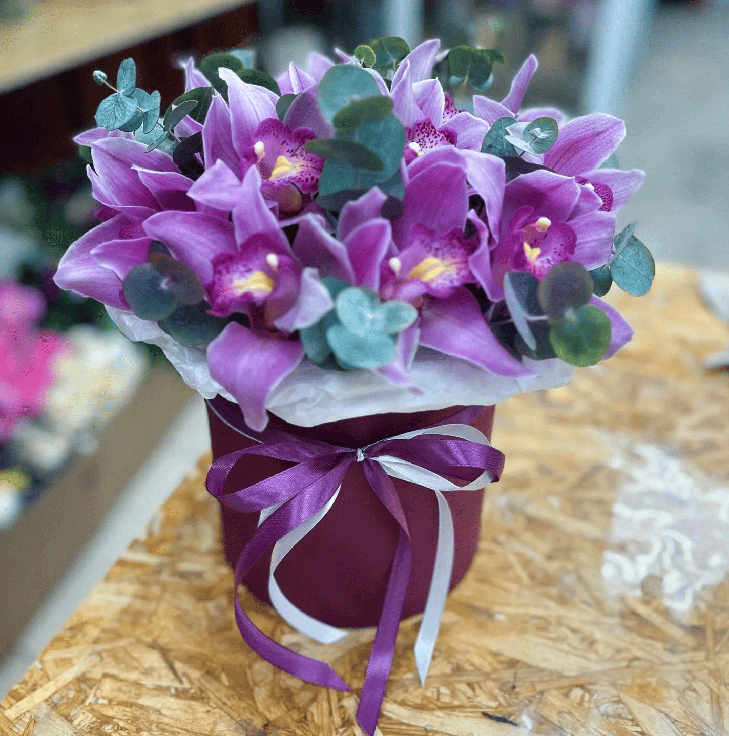 Композиция в шляпной коробке с орхидеей и эвкалиптом - это утончённый подарок с эффектом «вау». Благородная орхидея символизирует роскошь, красоту и восхищение, а свежий эвкалипт добавляет лёгкость, природную гармонию и стильный акцент. Вместе они создают элегантную композицию, которая выглядит современно и дорого.