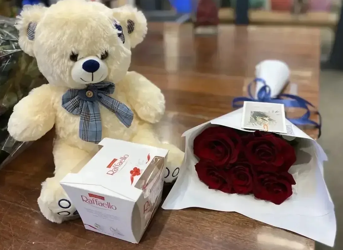 • Средний - 15 роз, игрушка, Раффаэлло 150 гр.
