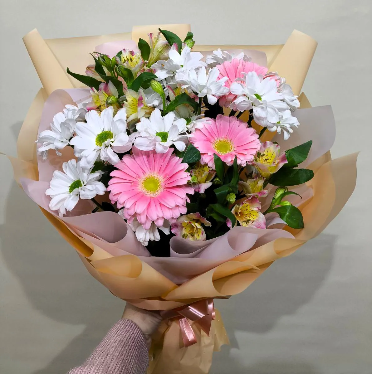- Средний - гербера - 5 шт., хризантема - 4 шт., альстромерия - 5 шт., зелень, упаковка, лента