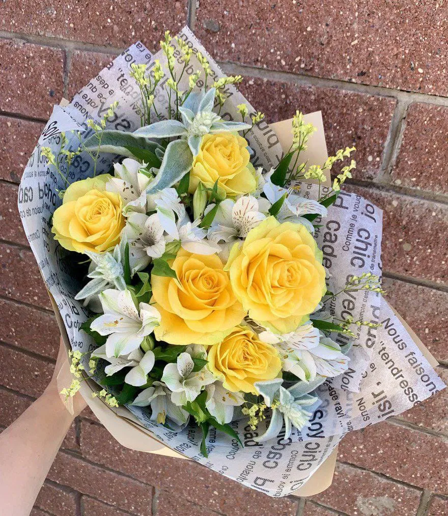 Гипсофила, облачённая в белое и желтое, нежно окутывает этот ансамбль, создавая впечатление воздушности и легкости. Как облака на ясном небе, она служит гармоничным фоном, подчеркивая красоту основных цветочных героев.