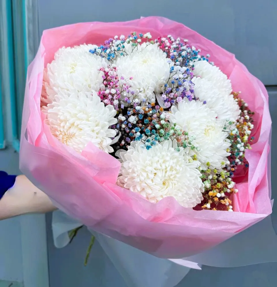 Эти цветы идеально подходят для создания атмосферы уюта и праздника. Радужная гипсофила добавляет яркие и весёлые акценты, гармонично дополняя белоснежные хризантемы. Такой букет станет прекрасным подарком на день рождения, свадьбу или просто как знак внимания.