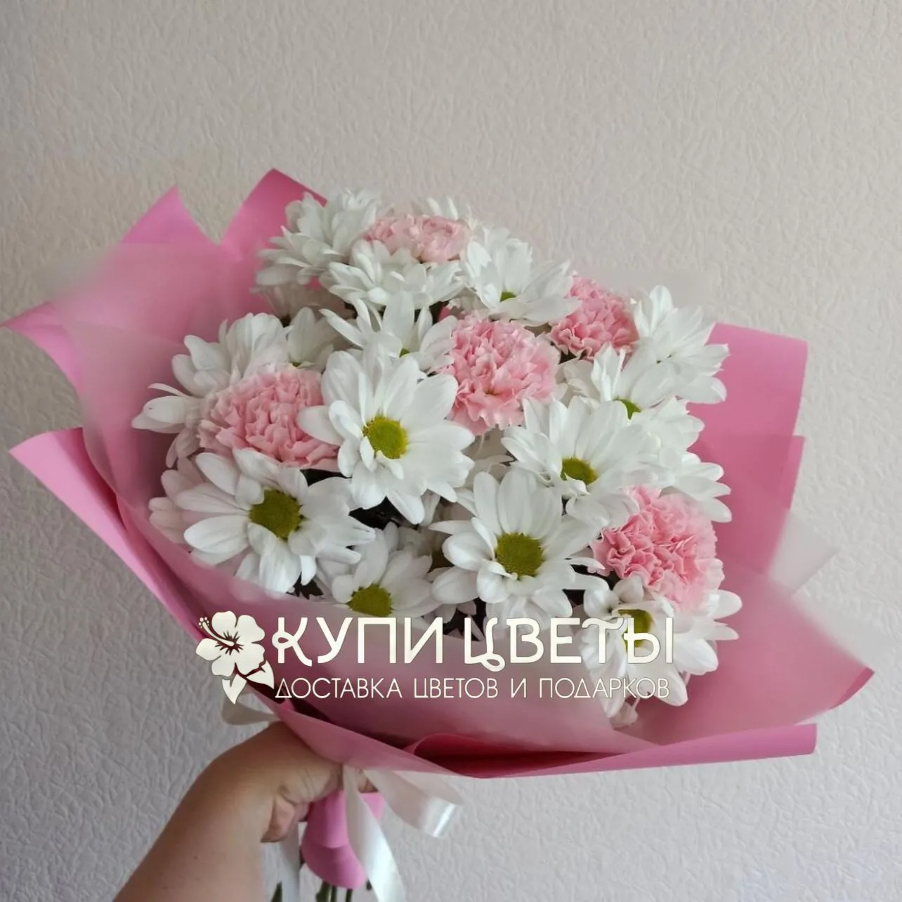 • Средний - гвоздики - 9 шт., кустовая хризантема - 4 шт., зелень, упаковка, лента