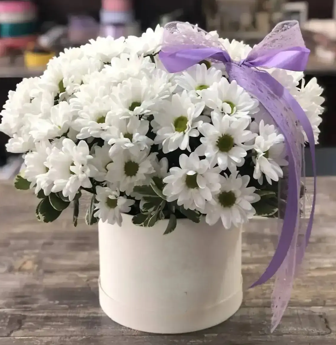 Закажите шляпную коробку с белыми ромашковыми кустовыми хризантемами уже сегодня и подарите свою любовь и заботу в каждом лепестке!