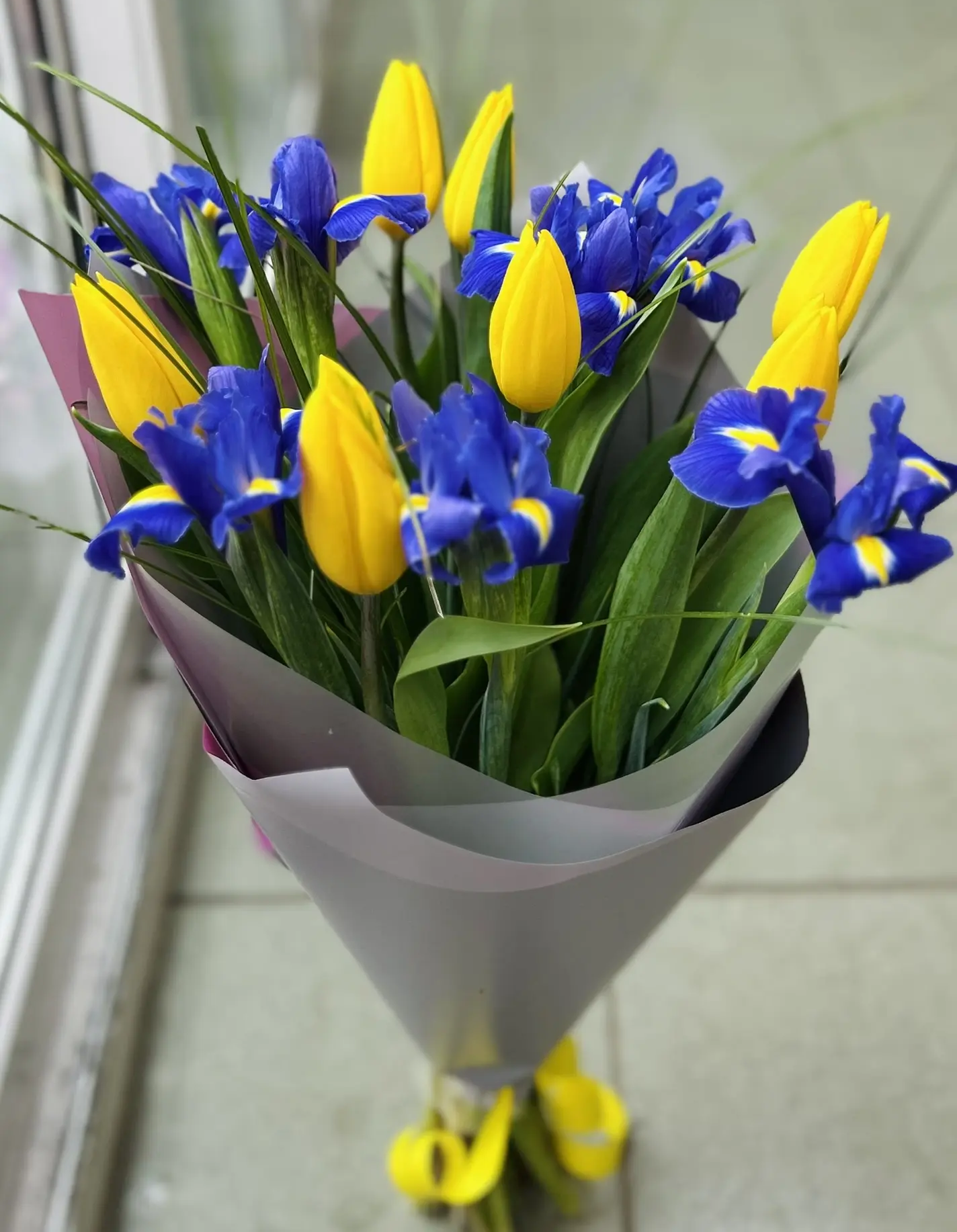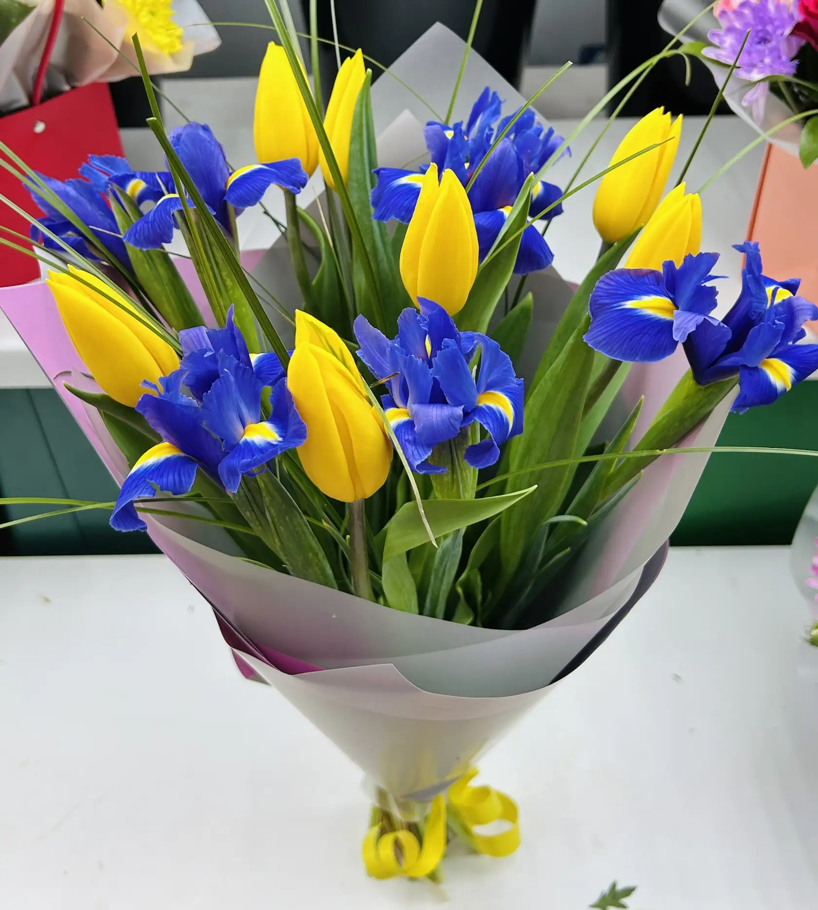 • Средний - тюльпан - 7 шт., ирис - 8 шт., зелень, упаковка, лента