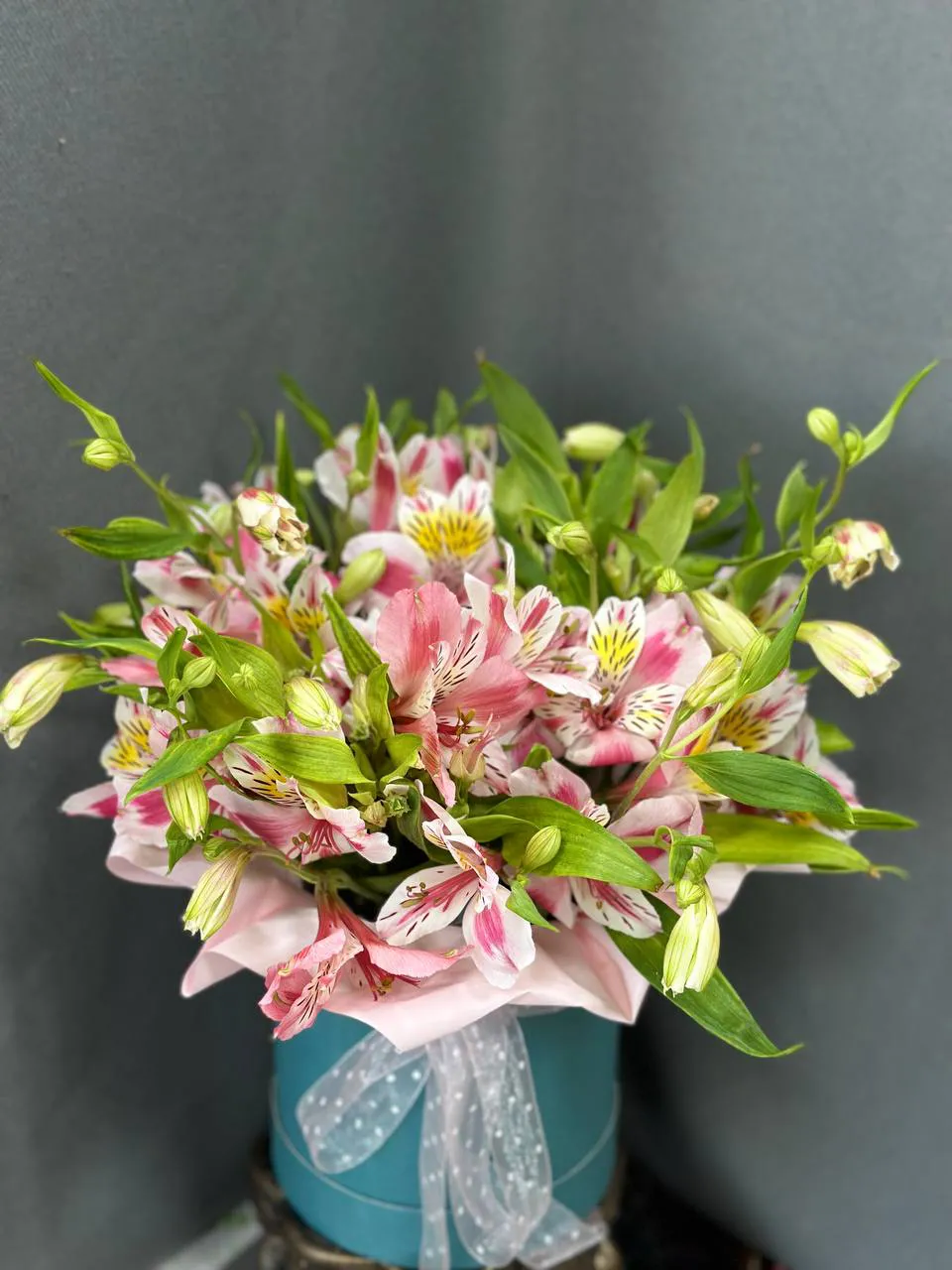Состав букета: альстромерия, шляпная коробка, оазис, лента