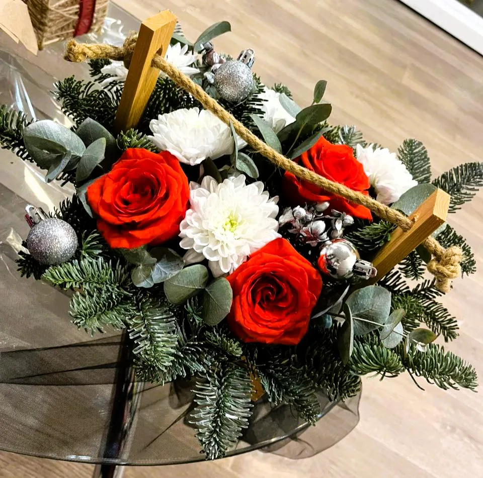 Розы,хризантемы, зелень, нобилис,декор,корзина |