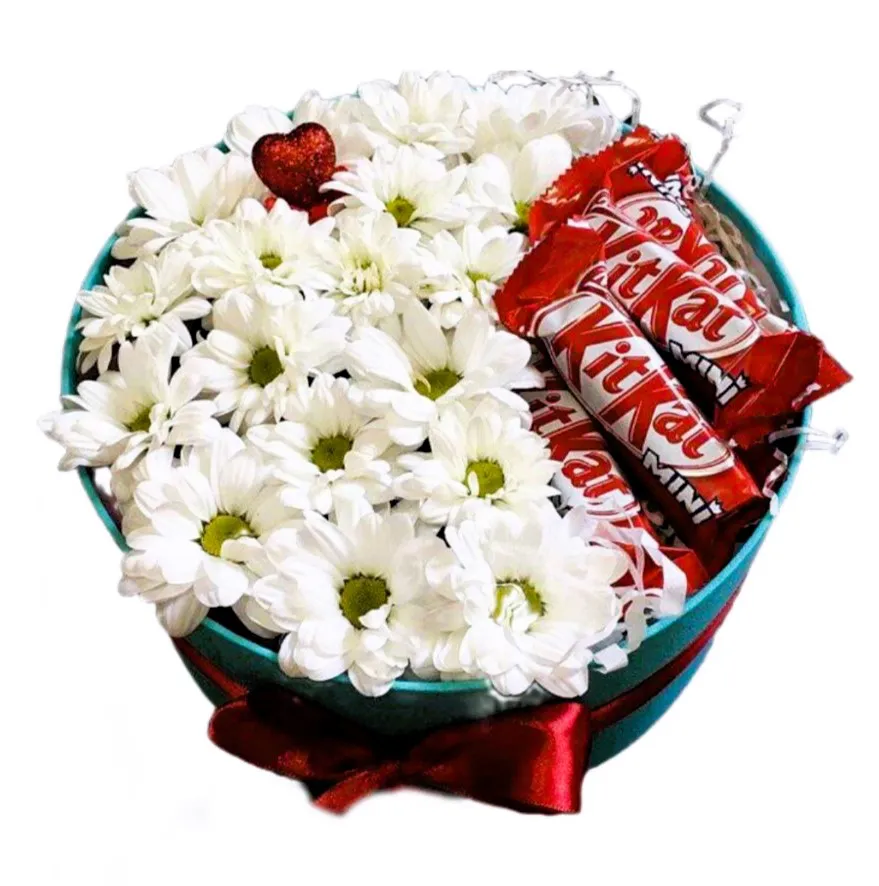 Ромашковые хризантемы, шоколадки , коробка, оазис |