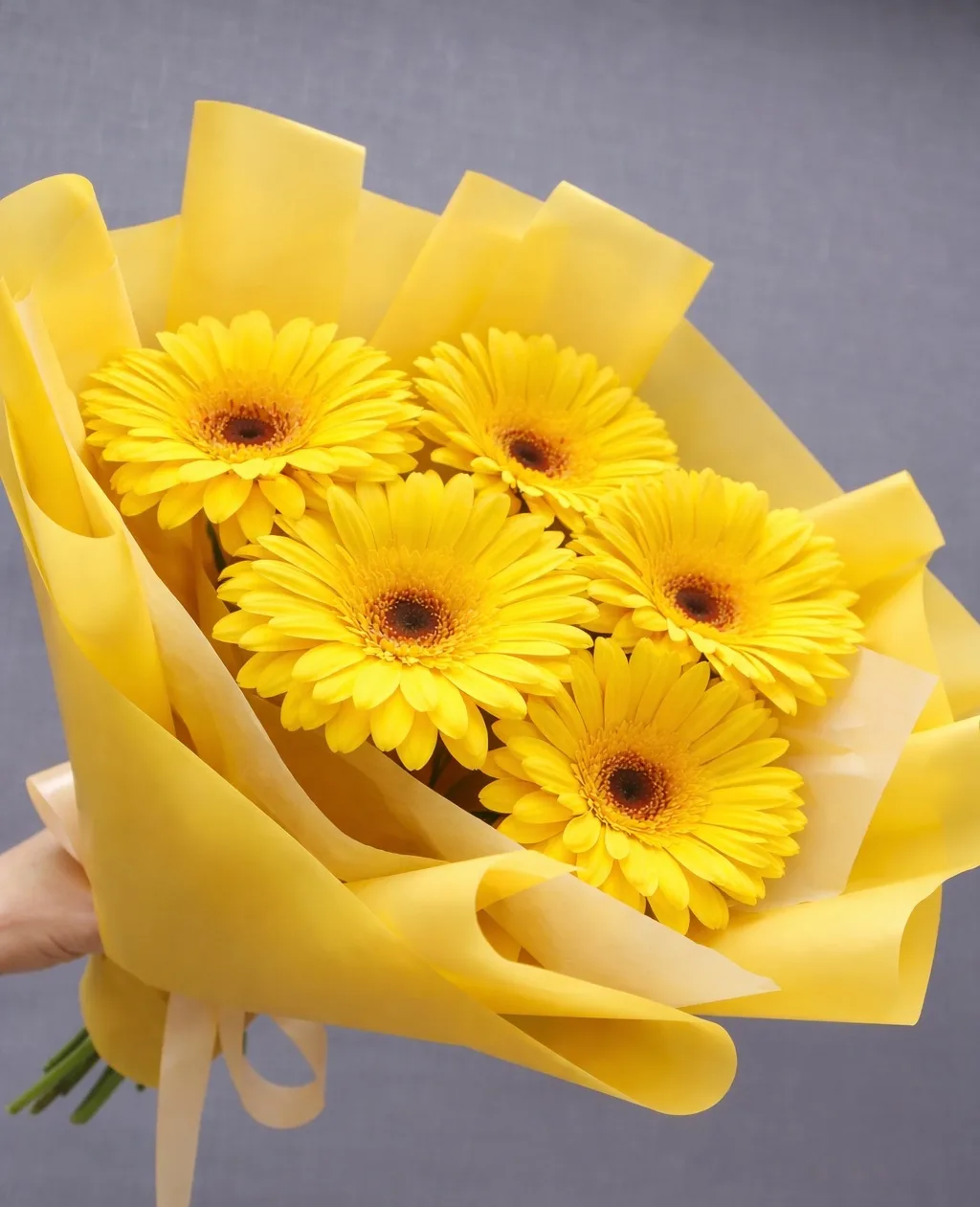 Солнечный букет из 5 ярких жёлтых гербер в гармоничной упаковке дарит тепло, радость и позитивное настроение. Идеальный подарок, чтобы поднять настроение и порадовать близкого человека.