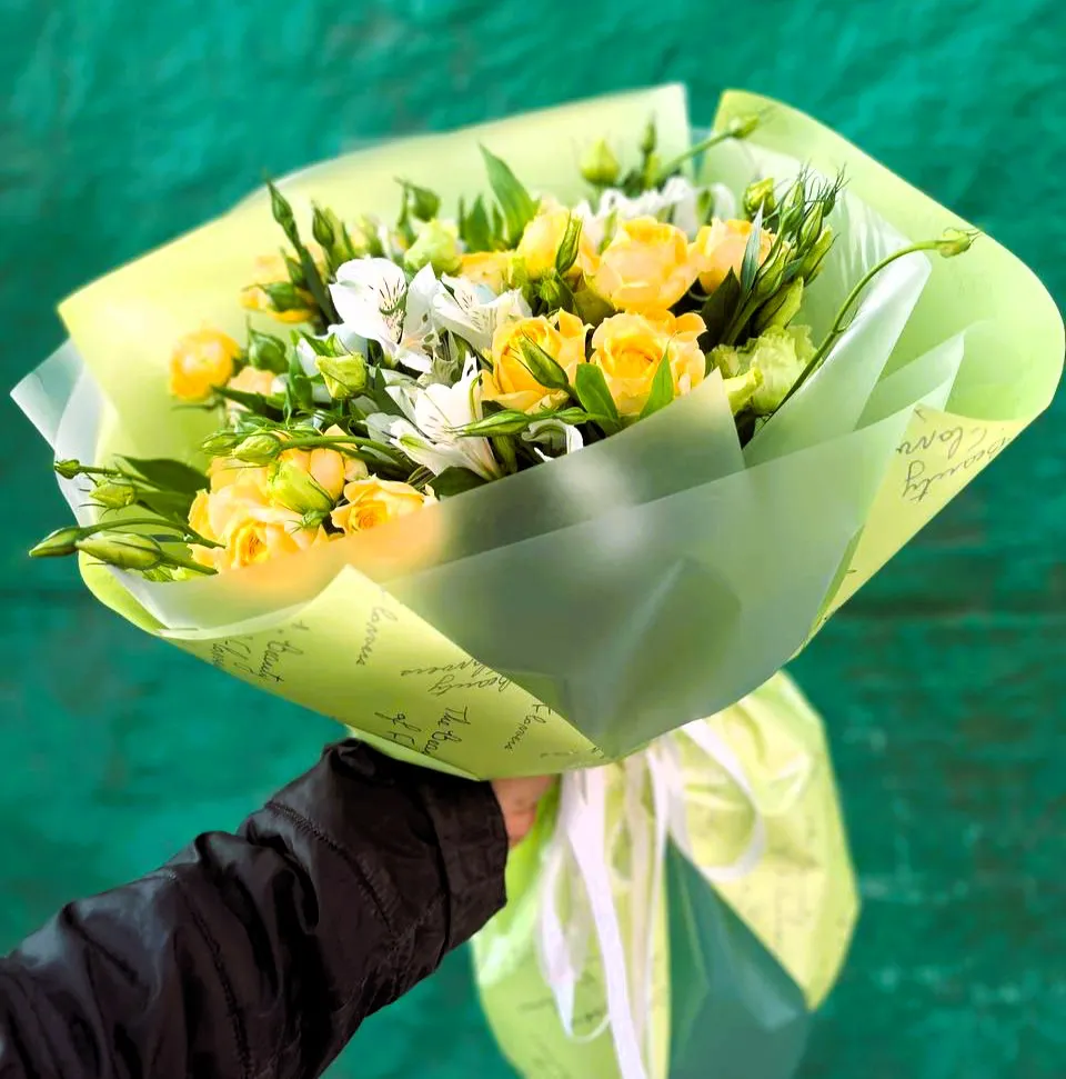 - Средний - кустовая роза - 5 шт., альстромерия - 7 шт.,упаковка,лента