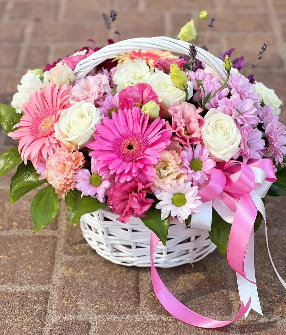 • Состав: роза - 5 шт., гербера - 3 шт., эустома - 3 шт., кустовая хризантема - 5 шт., зелень, оазис, корзина