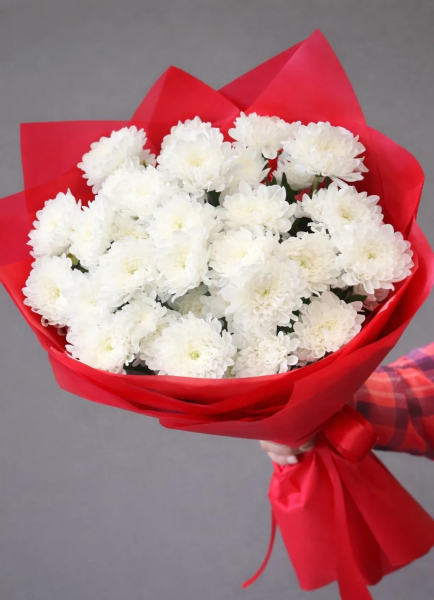 Эффектный букет, в котором нежная белая кустовая хризантема гармонично сочетается с насыщенной красной упаковкой, создавая яркий и запоминающийся контраст. Пышные соцветия придают композиции объём и лёгкость, наполняя её ощущением свежести и искренних эмоций.