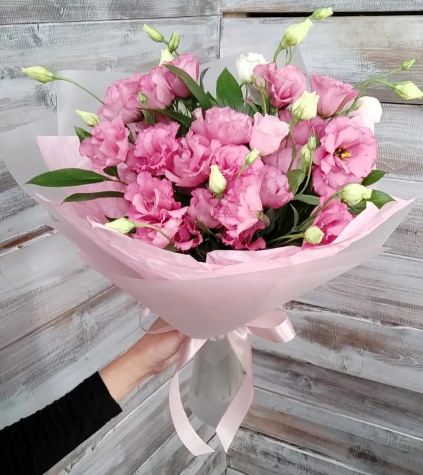 Эустома, зелень,упаковка, лента |