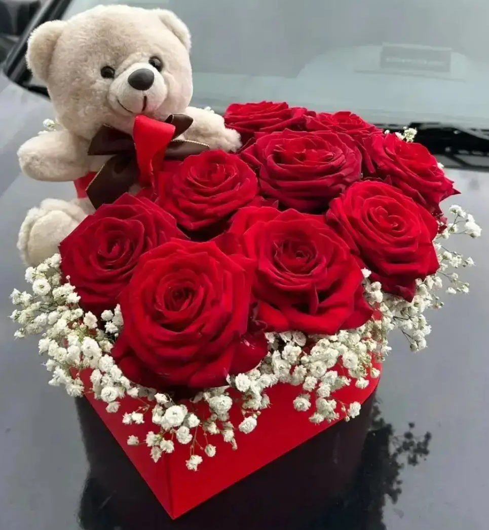 • Стандарт - розы - 9 шт. ,гипсофила, игрушка, топпер, оазис, коробка