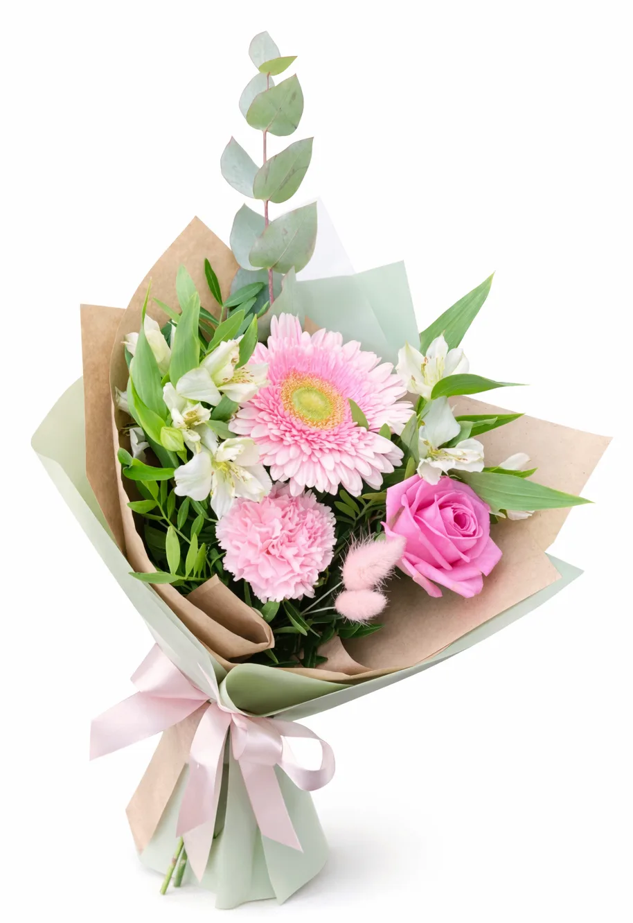 гербера-1шт, роза-1шт,гвоздика-1шт, алстромерия-2шт,зелень, упаковка, лента
