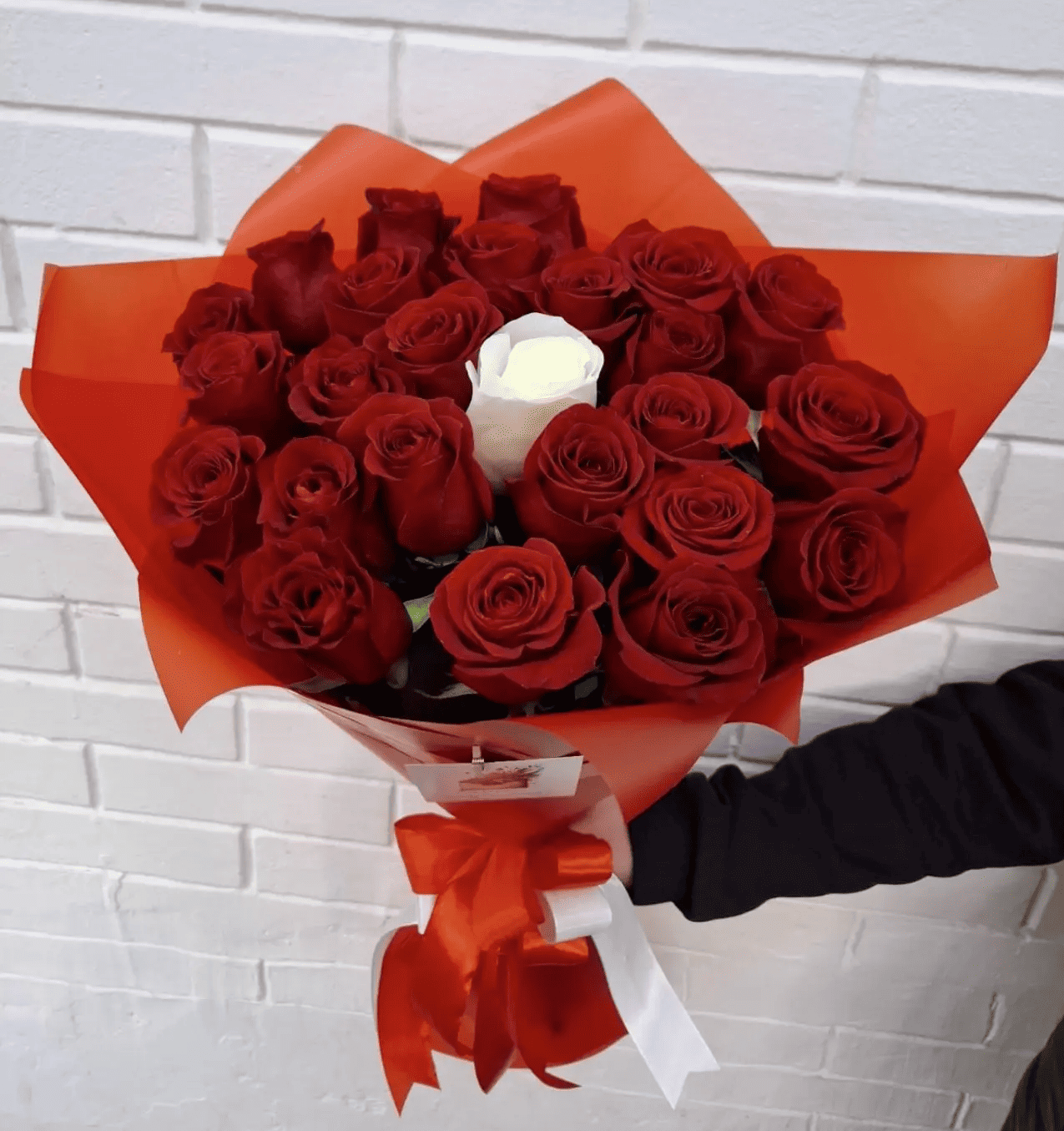 Роскошный букет из 24 красных роз с одной белой розой в центре - это выразительный символ любви, страсти и особого смысла. Глубокий алый оттенок лепестков подчёркивает силу чувств, а единственная белая роза в композиции становится акцентом чистоты, искренности и уникальности ваших эмоций.