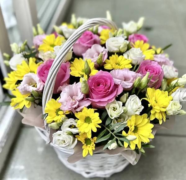 Розы, эустома, кустовая хризантема,зелень, оазис, корзина |
