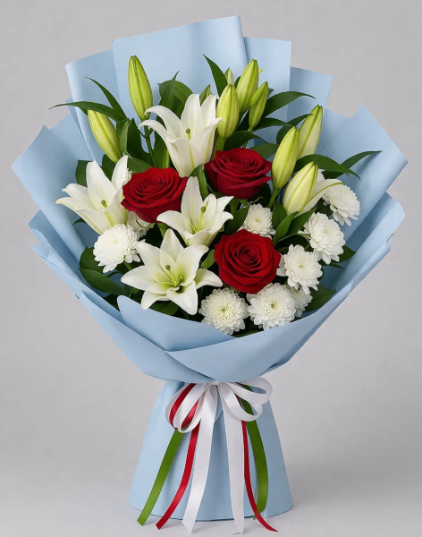 Эффектное сочетание нежных белых лилий, насыщенной красной розы и воздушной кустовой хризантемы создаёт гармоничный и выразительный букет. Стильная упаковка делает композицию идеальным подарком для ярких эмоций.