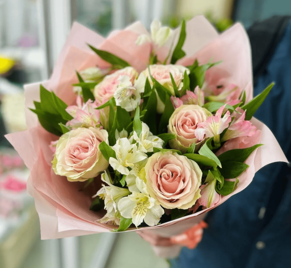 роза - 5 шт., альстромерия - 5 шт., упаковка, лента |