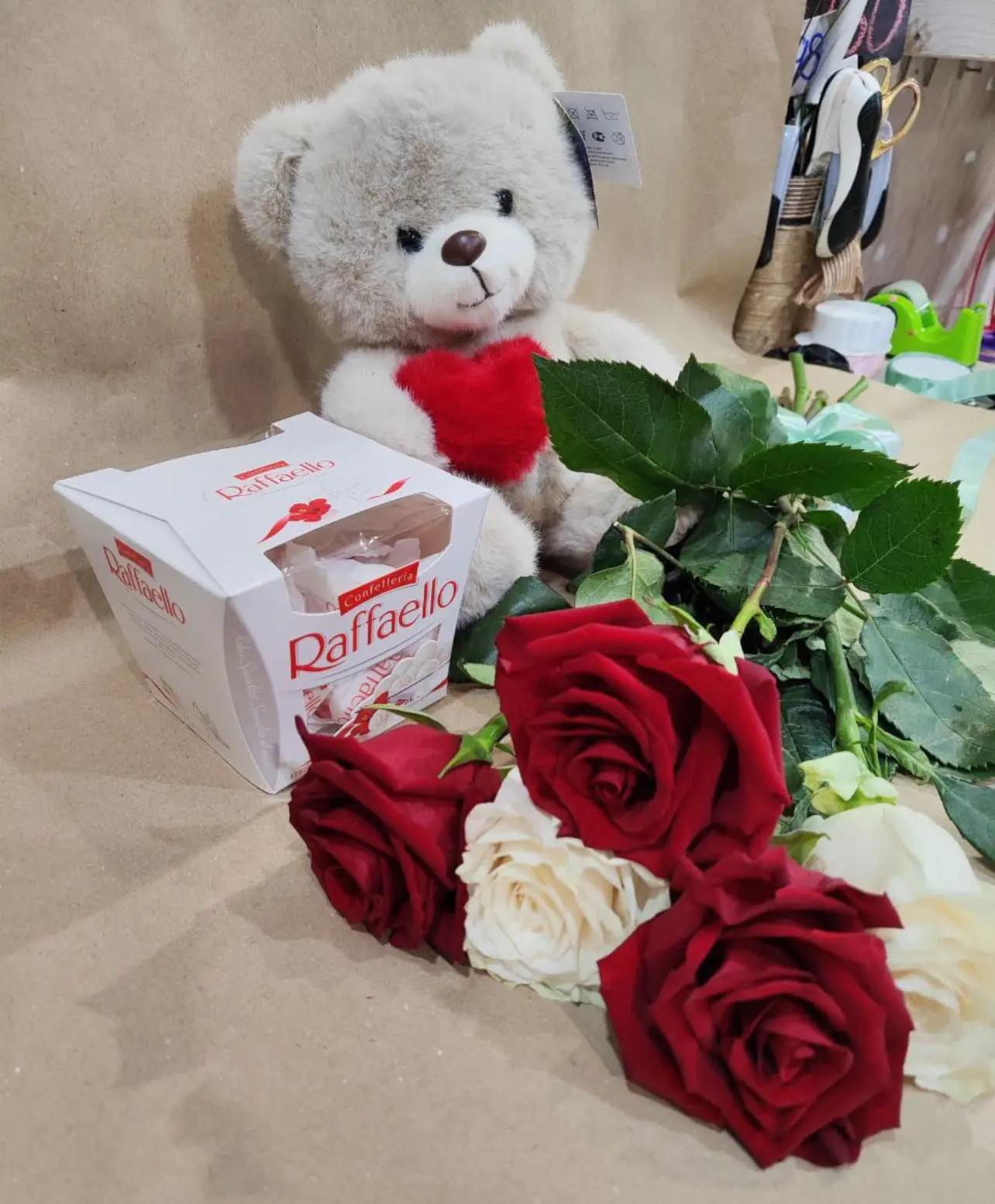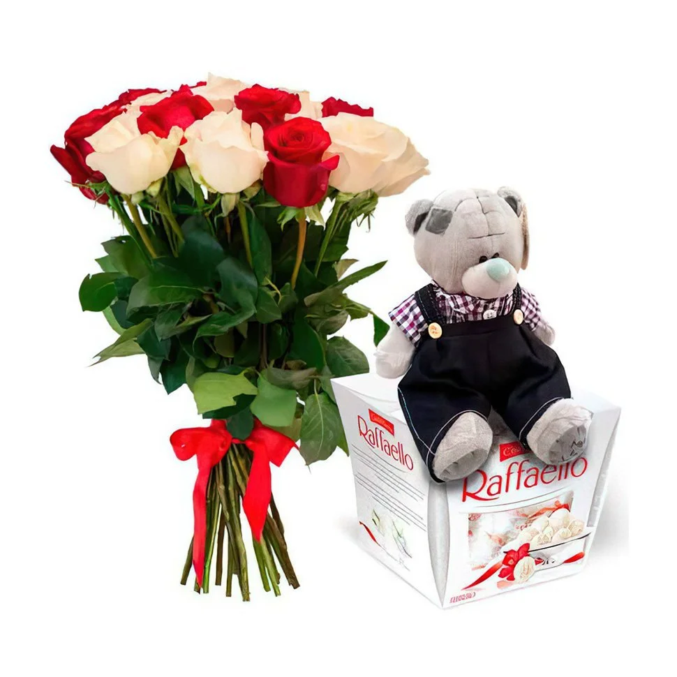 Букет из роз, мягкая игрушка 25 см и коробка Raffaello 150 гр.