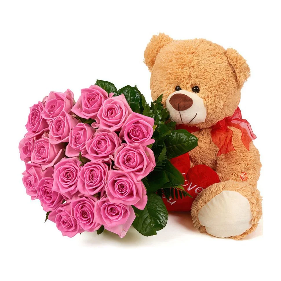 19 розовых роз и мягкая игрушка 25 см
